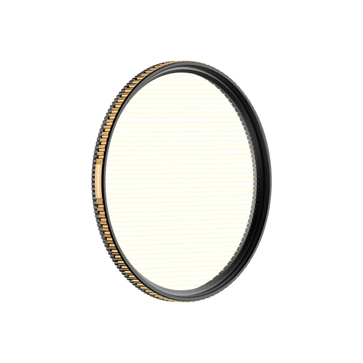The QuartzLine FX GoldMorphic streak filter adds professional anamorphic-style warm flares to your scene without the need for stylized cinema lenses. Streak filters mimic the anamorphic streak flare effect, causing streaks on bright light sources or reflections in the scene. Get creative and set the mood!